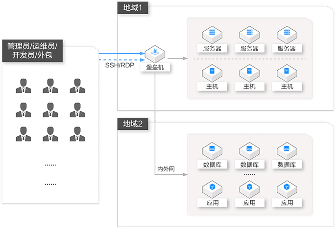 堡垒机作为统一的入口进行内部资产的管理和维护,用户无需记忆多个地址和多套账号密码。