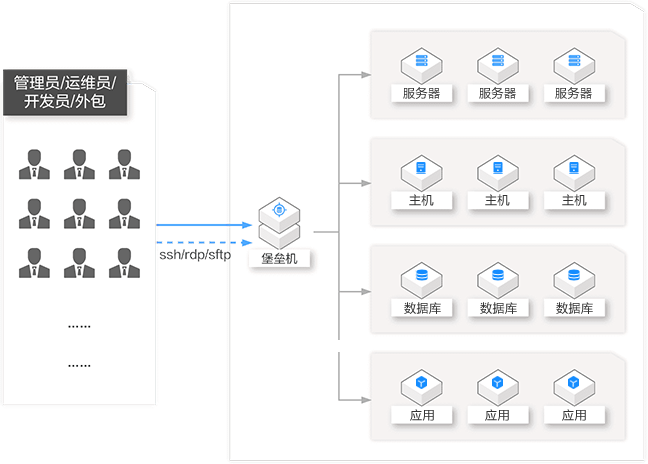 安全运维堡垒机平台用于集中管理资产权限,全程监控操作行为,实时还原运维场景,保障运维行为身份可鉴别、权限可管控、操作可审计,解决“众多资产难管理”、